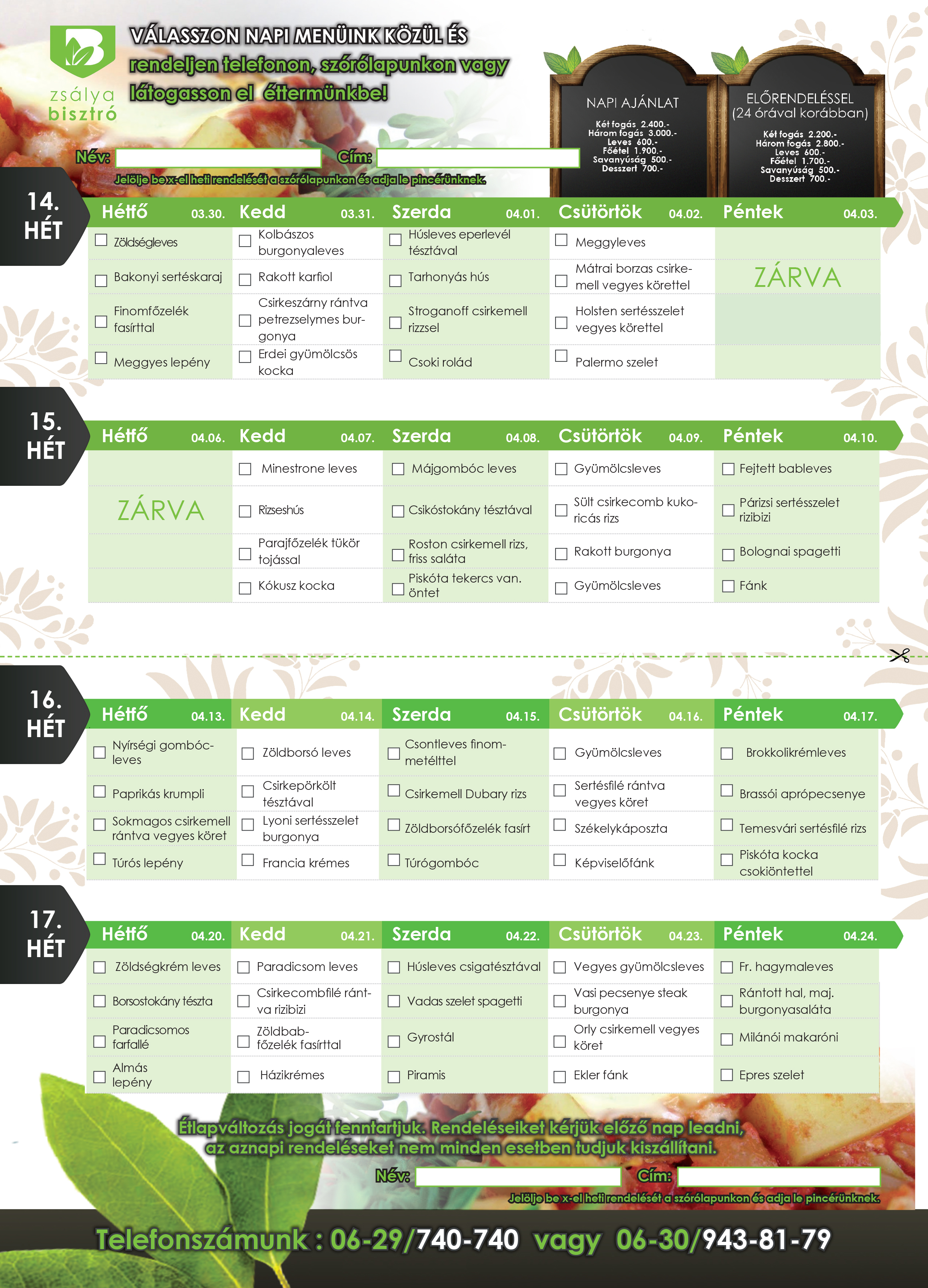 Menü rendelés leadása: H - P / 11:00 - 14:00-igRendelési feltételek: